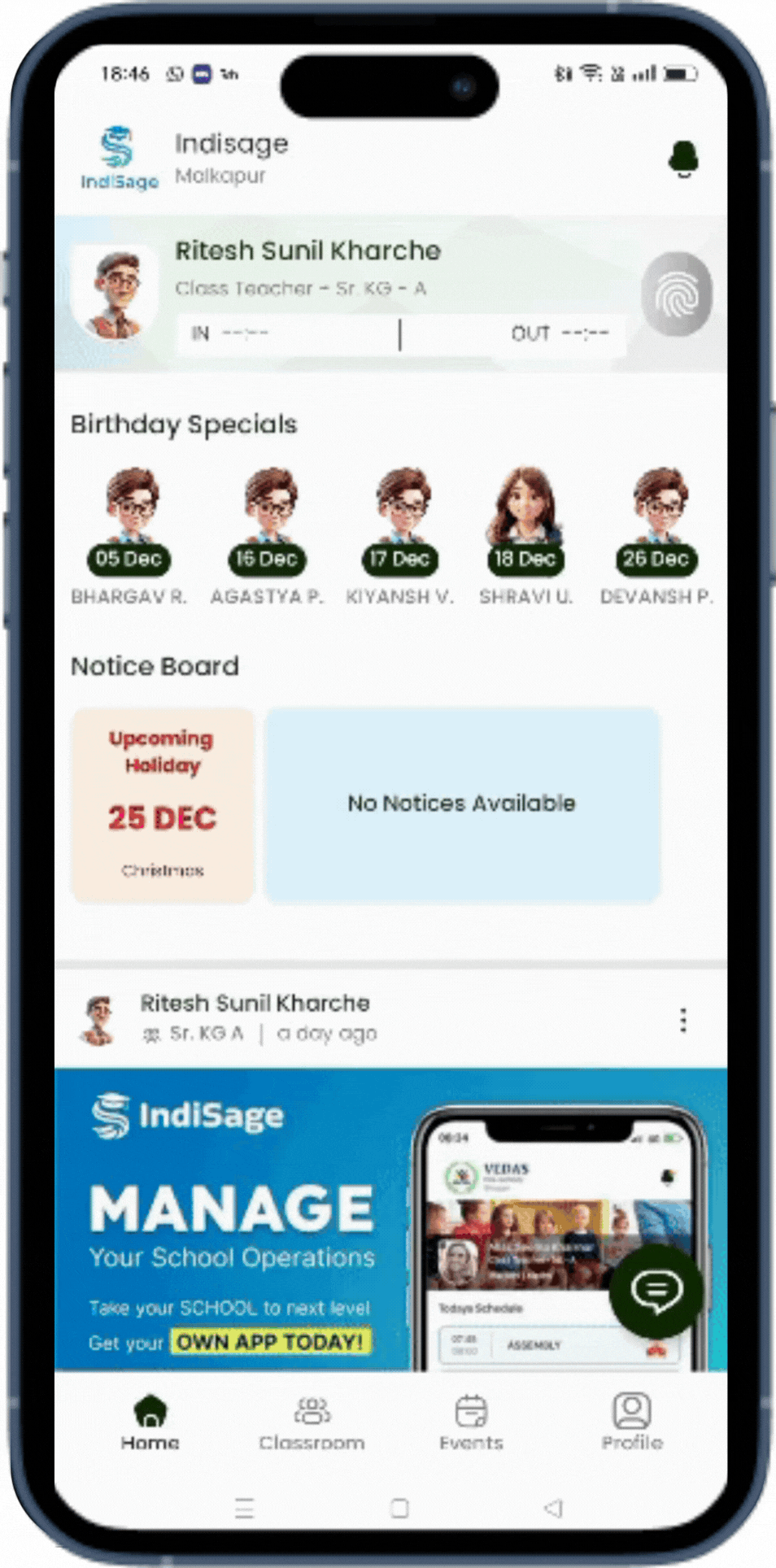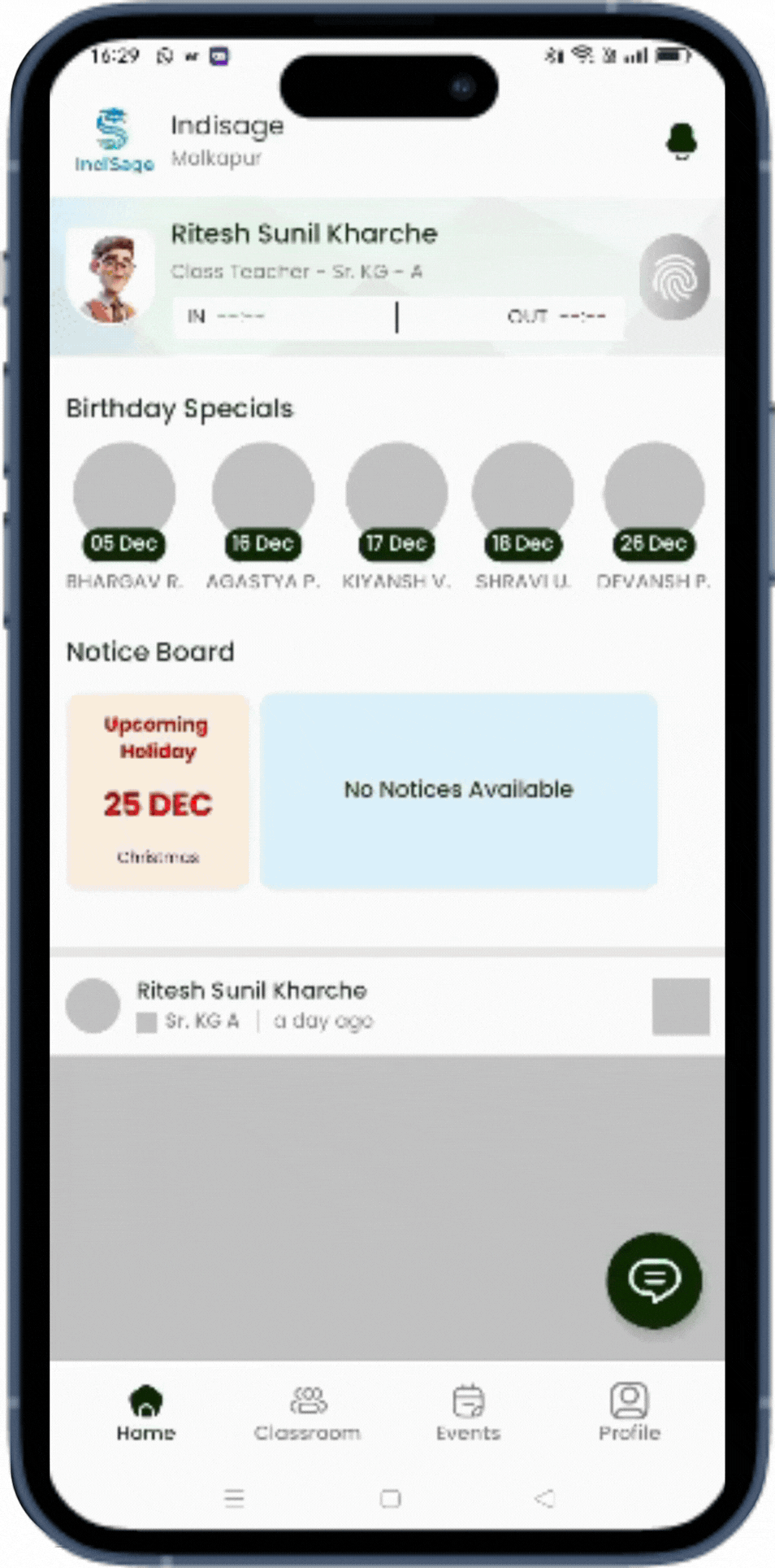 Enable seamless teacher attendance tracking directly from the home screen. With the “Mark In” and “Mark Out” options, teachers can record their arrival and departure times effortlessly. This feature ensures accurate attendance logging, supports efficient record-keeping, and promotes accountability, all while simplifying the daily workflow for educators.